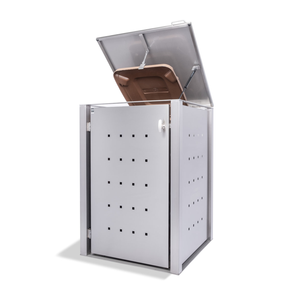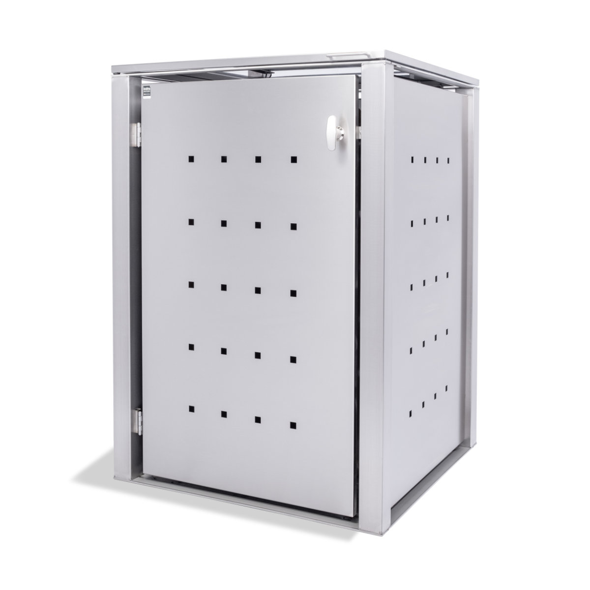 Diese Mülltonnenbox besteht komplett aus Edelstahl V2A und bietet ausreichend Platz für zwei Tonnen mit einem Fassungsvermögen von bis zu 240 Liter. Seiten- und Rückwände sowie Türen sind mit einer Lochung hergestellt, das der Box das gewisse Etwas verleiht. Das serienmäßig enthaltene Klappdach stellt einen sehr bequemen Einwurf des Abfalls in die Mülltonnen sicher. Durch das pflegeleichte Edelstahl Material lässt sich die Müllbox einfach reinigen.