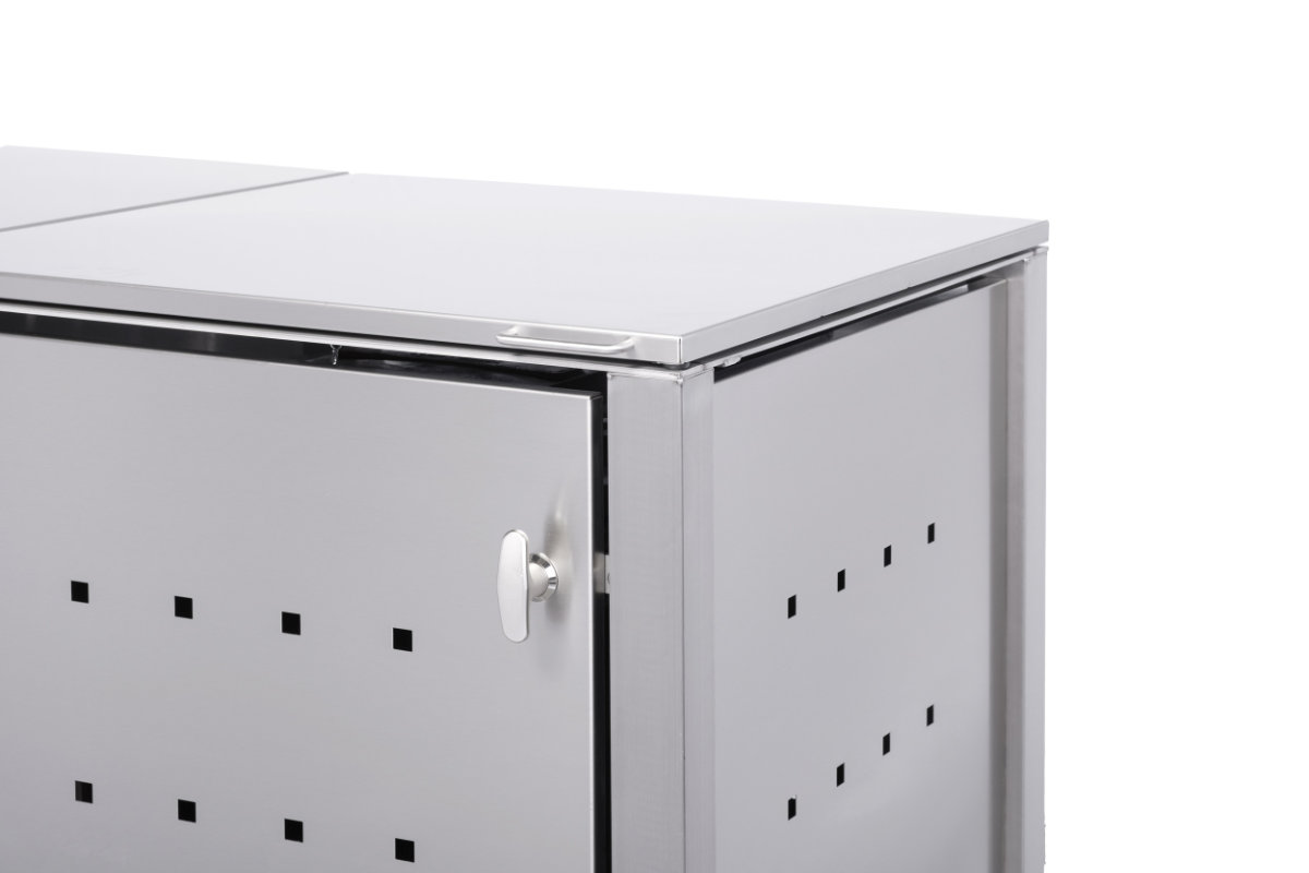 Diese Mülltonnenbox besteht komplett aus Edelstahl V2A und bietet ausreichend Platz für zwei Tonnen mit einem Fassungsvermögen von bis zu 240 Liter. Seiten- und Rückwände sowie Türen sind mit einer Lochung hergestellt, das der Box das gewisse Etwas verleiht. Das serienmäßig enthaltene Klappdach stellt einen sehr bequemen Einwurf des Abfalls in die Mülltonnen sicher. Durch das pflegeleichte Edelstahl Material lässt sich die Müllbox einfach reinigen.